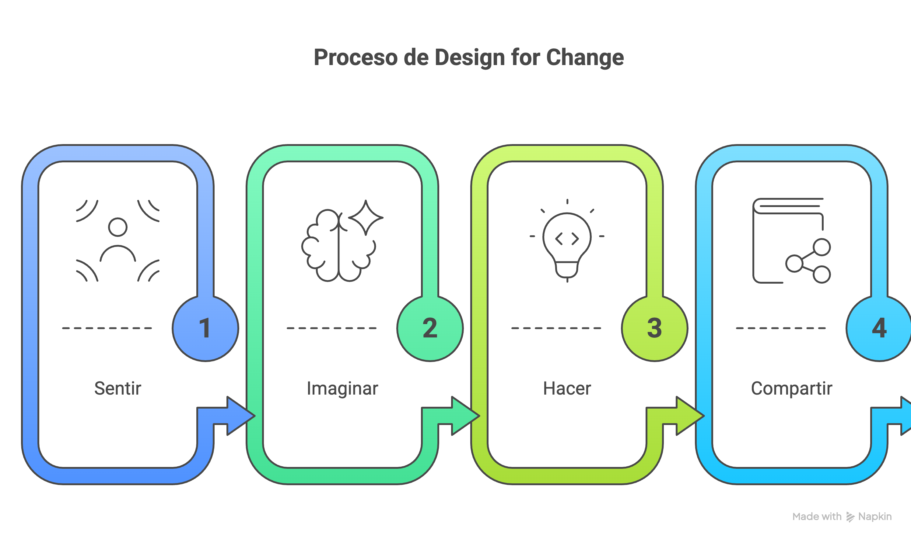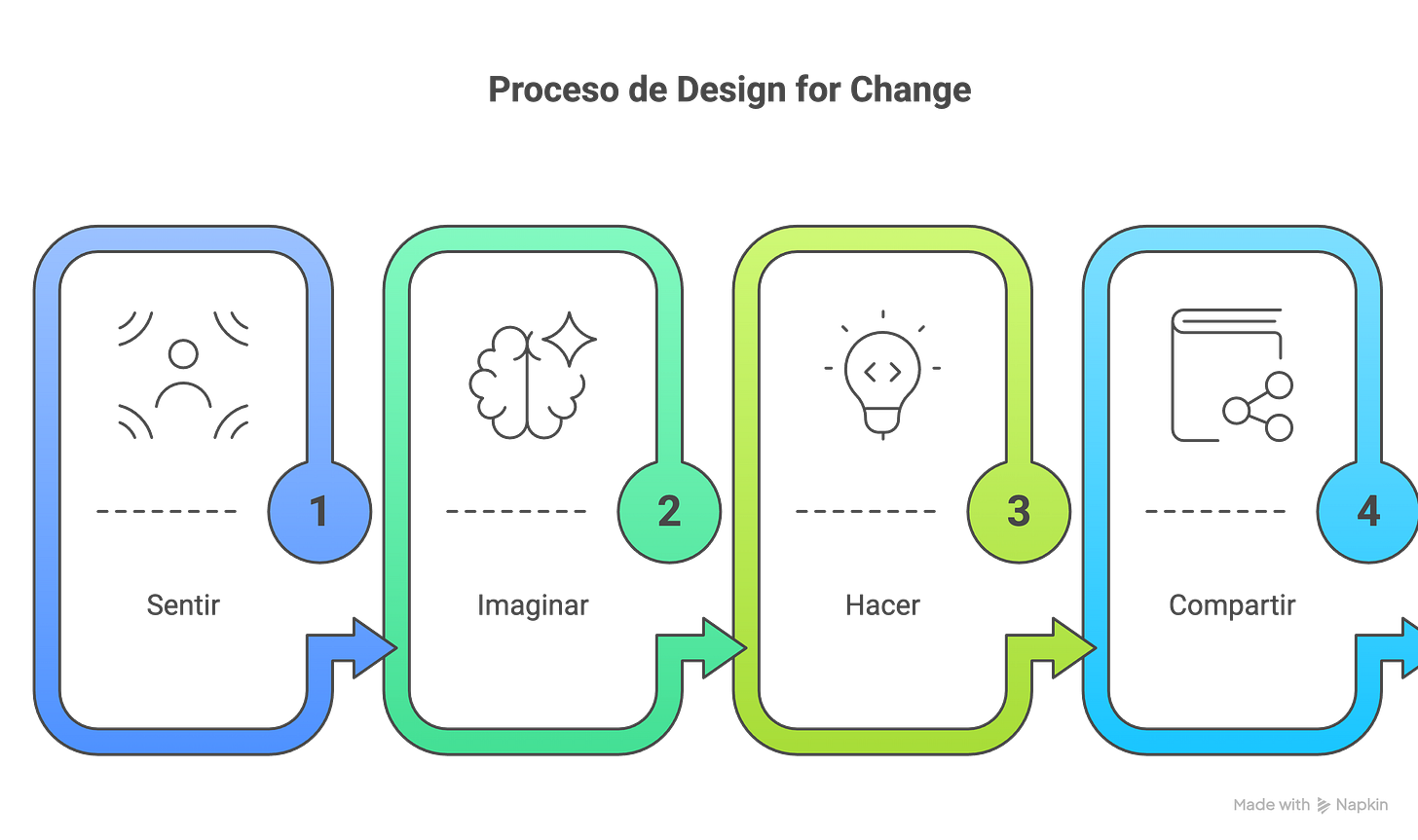 Algo similar ocurre con el enfoque de design for change, que introduce una dimensión adicional: no basta con diseñar soluciones, hay que llevarlas a la acción y generar impacto. Sentir, imaginar, hacer y compartir.