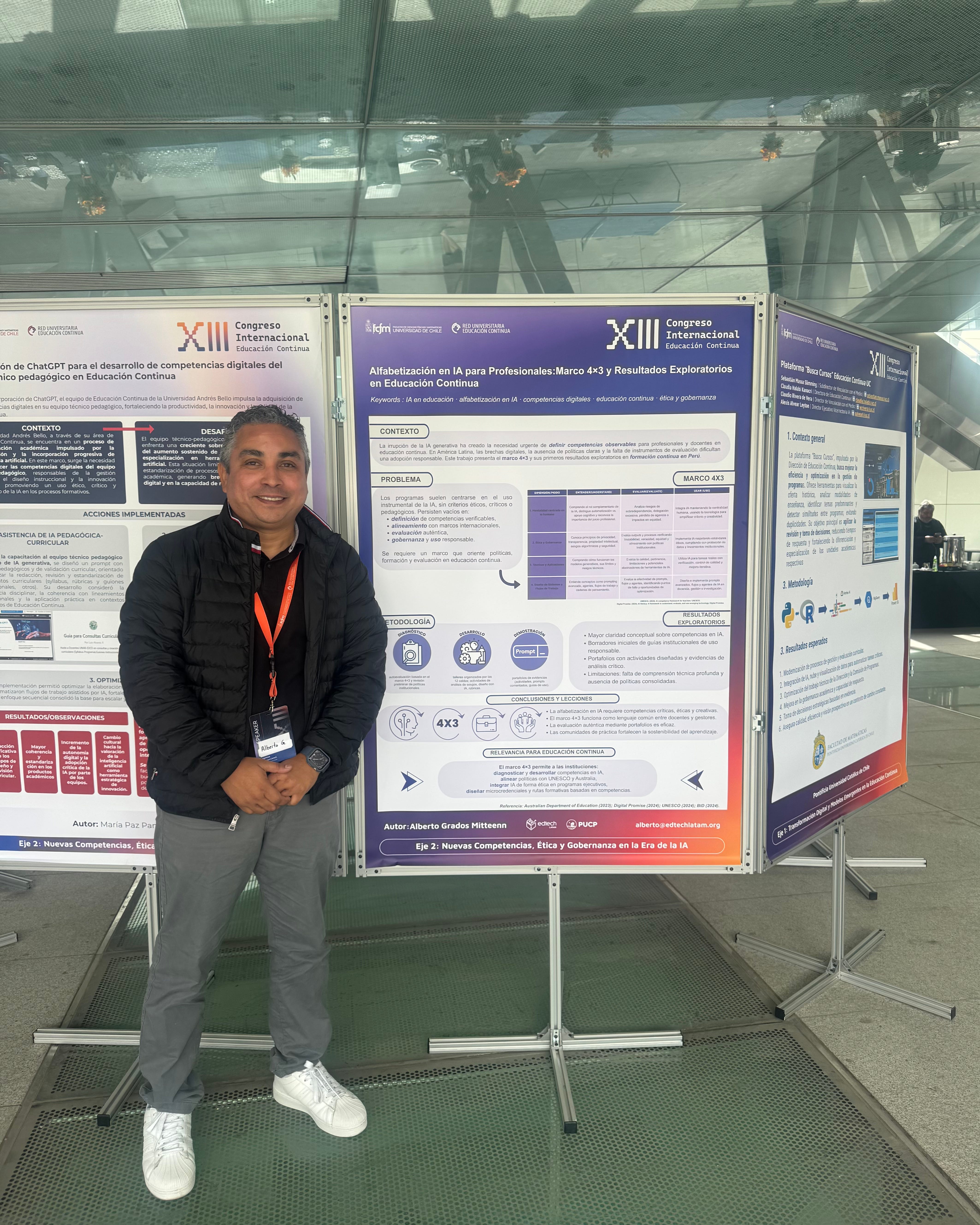 Los días 25 y 26 de noviembre participé en el XIII Congreso Internacional de Educación Continua “IA y Transformación Digital en la Educación Continua Universitaria”, organizado por la Red Universitaria de Educación Continua de Chile. Viajé para presentar mi estudio exploratorio “Alfabetización en IA para profesionales: marco 4×3 y experiencias de implementación en América Latina”. La intención de este trabajo de investigación, al que fui invitado a participar hace poco más de un año, fue el poder hacer un aporte a las instituciones educativas, dada la coyuntura: